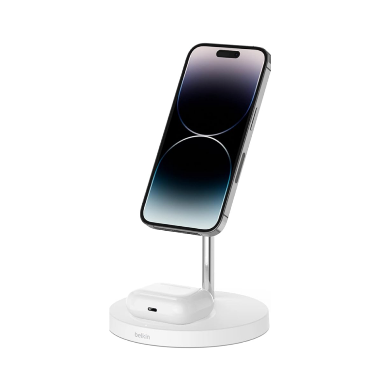 Подставка для беспроводного зарядного устройства Belkin BOOSTCHARGE PRO MagSafe 2 в 1 белого цвета обеспечивает мощность зарядки 15 Вт.